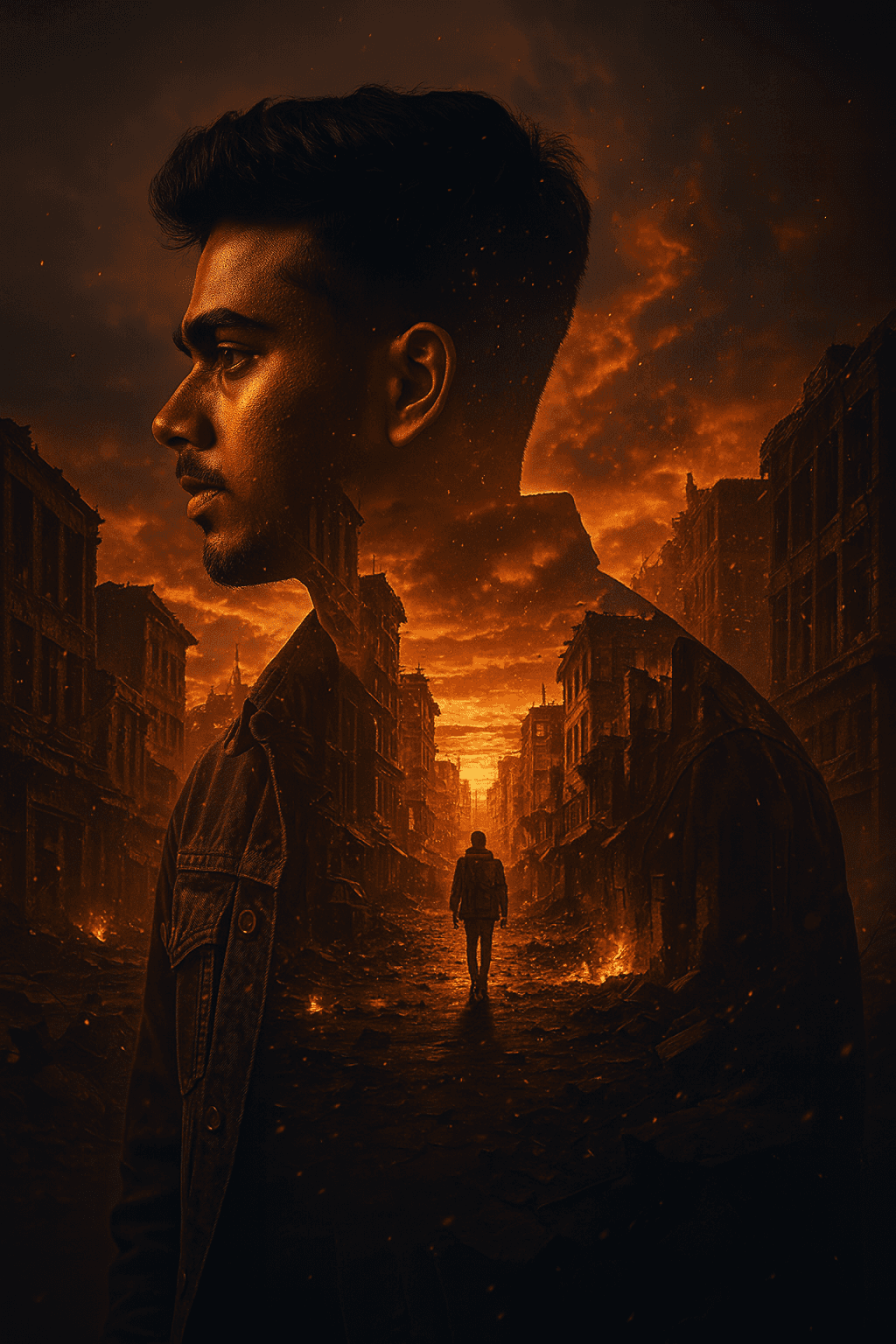 A cinematic double exposure of me in profile, with a post-apocalyptic cityscape inside his silhouette.The inner scene shows the man walking through a destroyed, burning urban street, buildings in ruins, glowing embers and fire, with a dramatic sunset in the background. Moody lighting, warm tones, emotional and introspective mood, high detail, 8K resolution