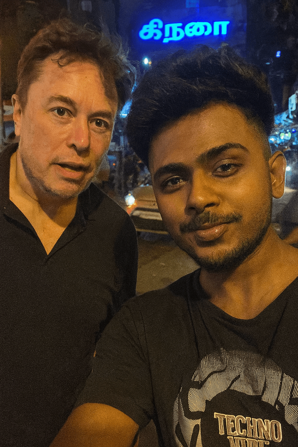 An awkward and spontaneous iPhone selfie taken on a noisy Chennai city street at night. The image features elon musk standing together in a casualy captured moment. The selfie is poorly composed, off-center, and taken with one hand as if the phone was pulled out suddenly. The South Asian man's appearance including his exact facial features, hairstyle, skin tone beard style, expression, and head angle must be identical to the uploaded image, without any alterations or Al modifications. His outfit and body posture should also match the uploaded phato exactly.
