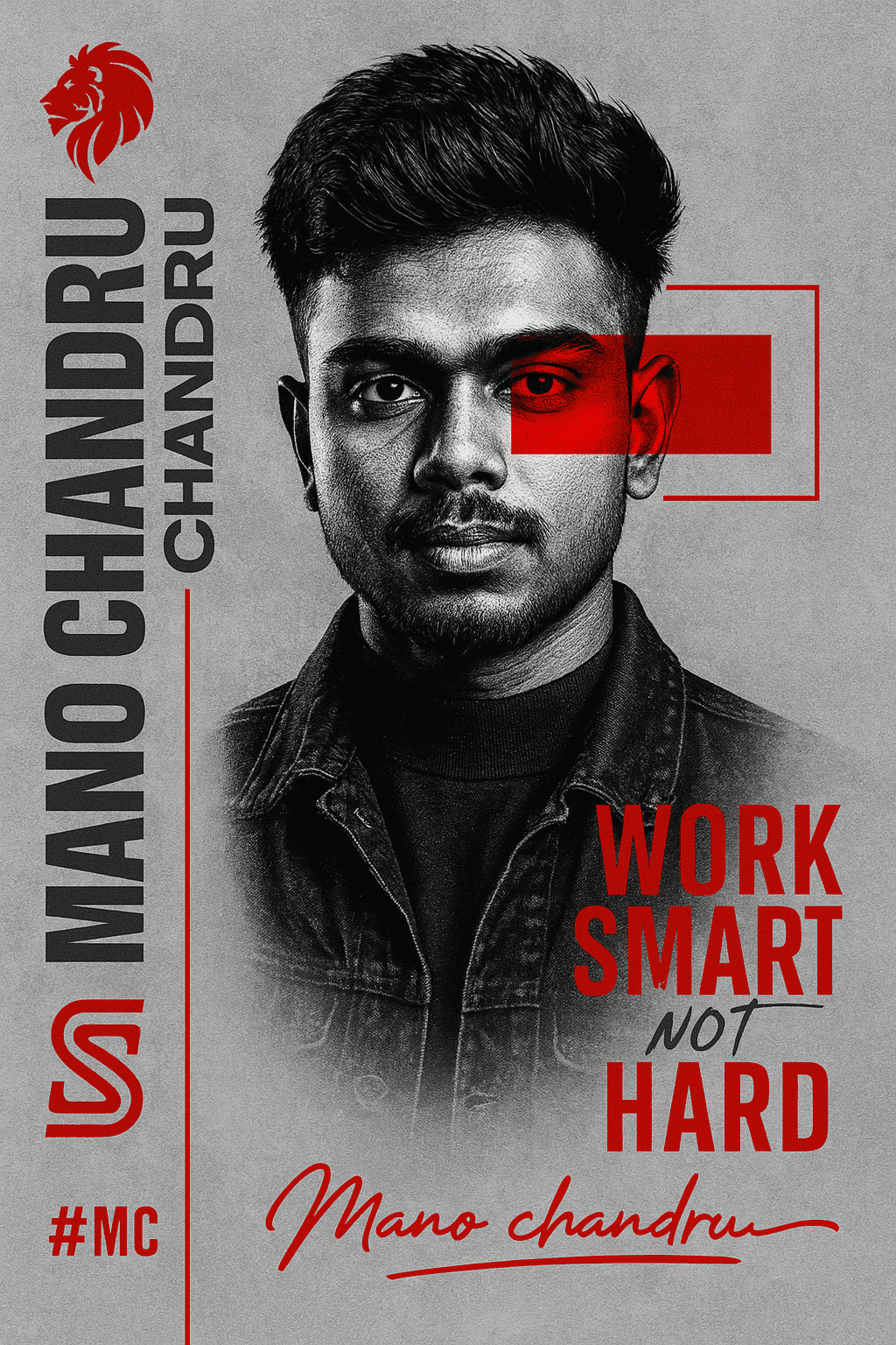At the bottom right, the phrase "WORK SMART NOT HARD" is written in bold red capital letters, with "SMART" in a smaller, elegant cursive script beneath it signed off with "Mano chandru" in a matching style, suggesting a personal or brand signature.