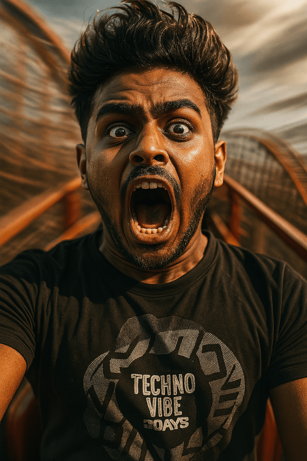 Cinematic close-up of a person on a roller coaster, captured mid-drop from a high point. The face shows an intense expression with wide eyes and mouth open, hair flying backward in strong wind. The background is motion-blurred to emphasize speed. The lighting is dramatic, colors are vibrant, and the overall scene feels like it’s from a high-end action movie — ultra-realistic, shallow depth of field, captured at the peak of adrenaline.