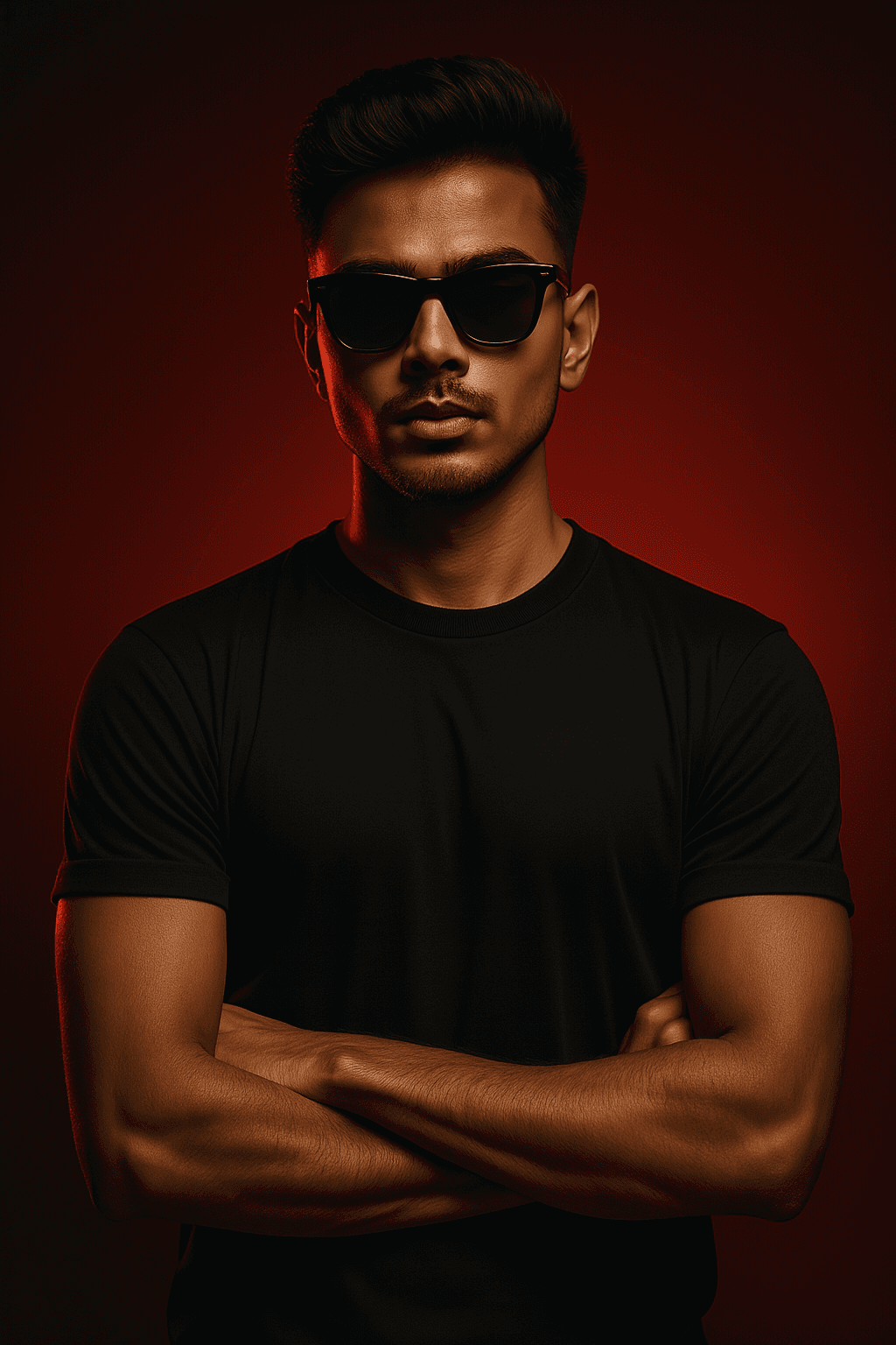 A highly stylized portrait of same person in image with sharp features, flawless fair skin, wearing a black t-shirt, black sunglasses and standing against a bold red gradient background, confidently. The lighting is dramatic and cinematic, emphasizing his facial structure and giving a luxury fashion magazine vibe.