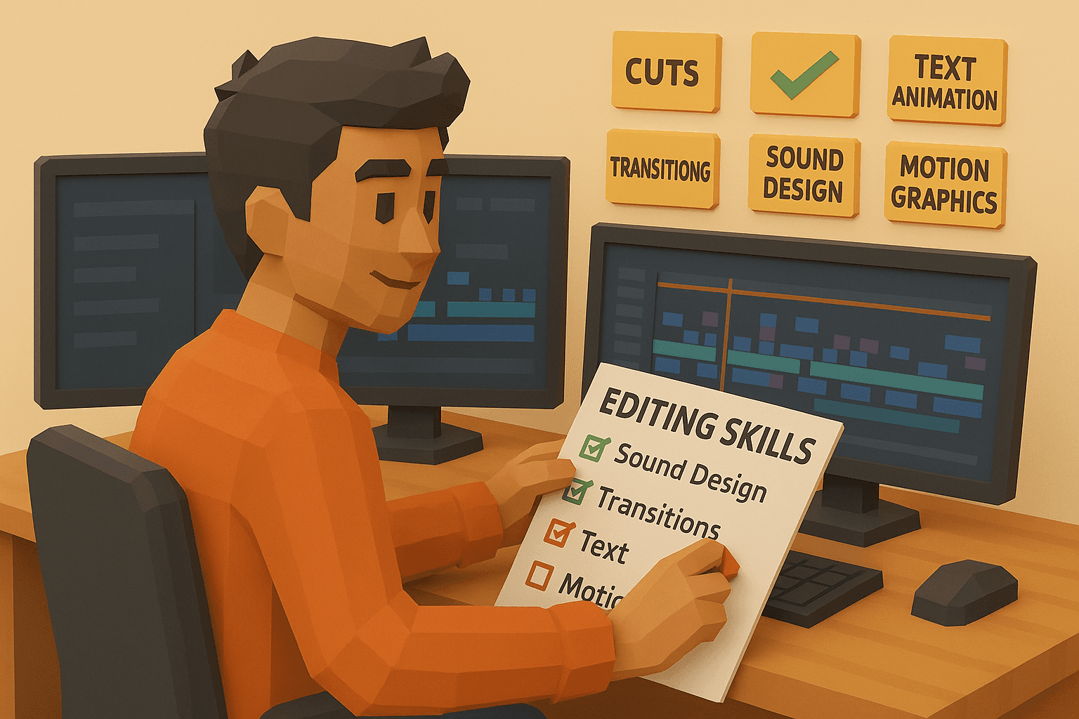 Gauge where you currently stand in key video editing skills—from basic cuts to color grading and sound design.